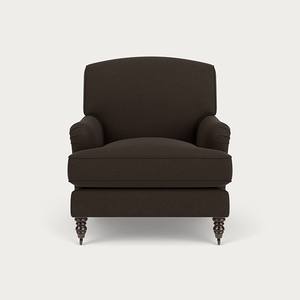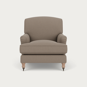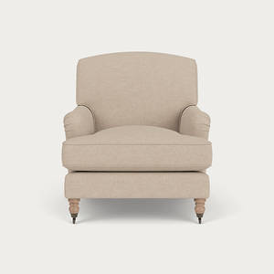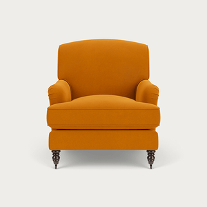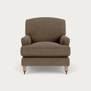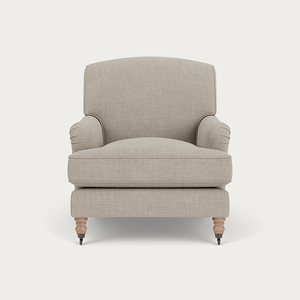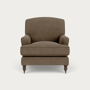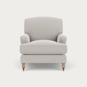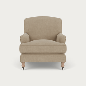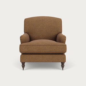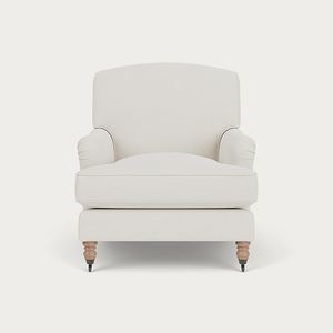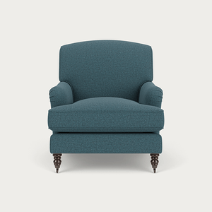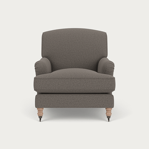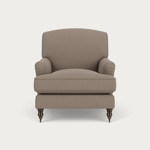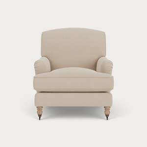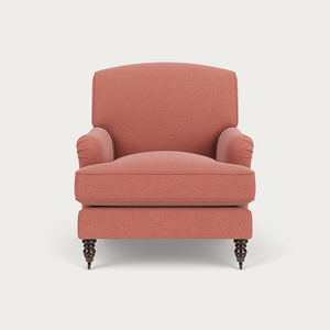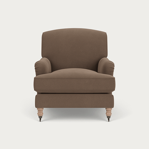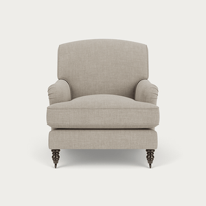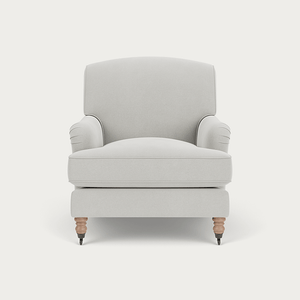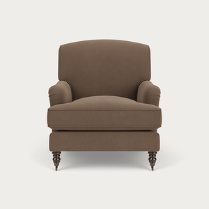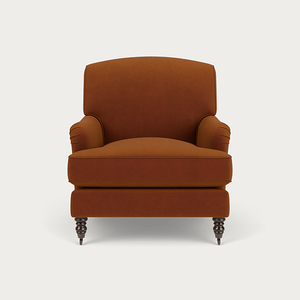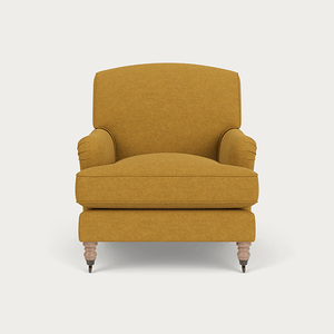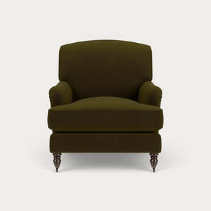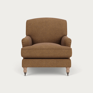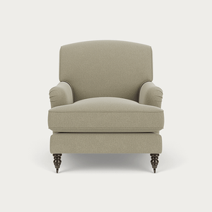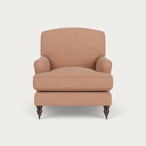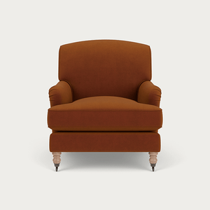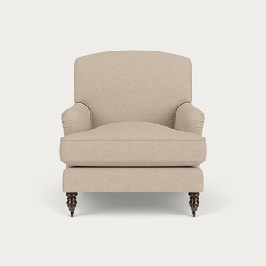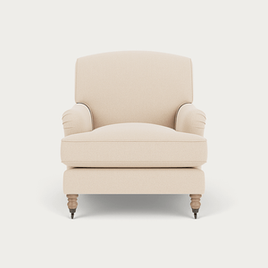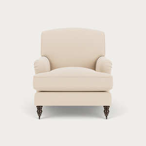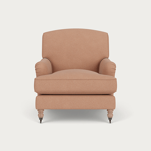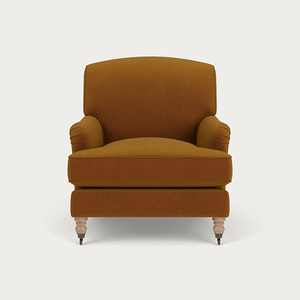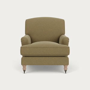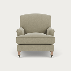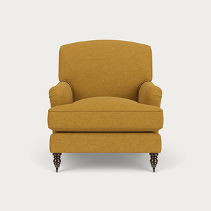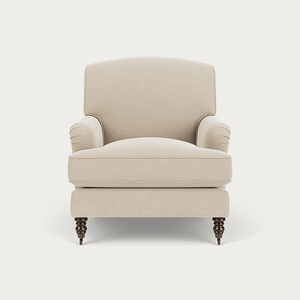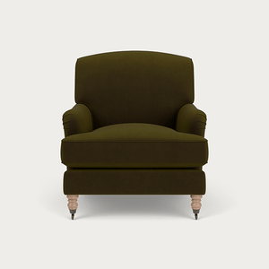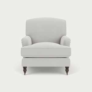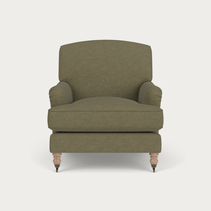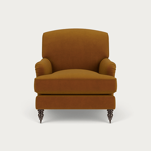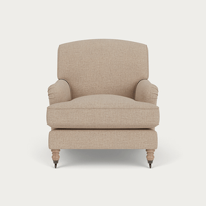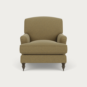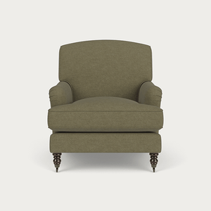 This armchair’s stately silhouette draws upon classic English upholstery, with a generous seat and integrated back that’s perfect for scatter cushions. Neat scroll and tuck details to the backrest and armrests give it a smart, tailored look. Resting on traditional turned legs and brass castors, Olivia is an armchair for the ages.