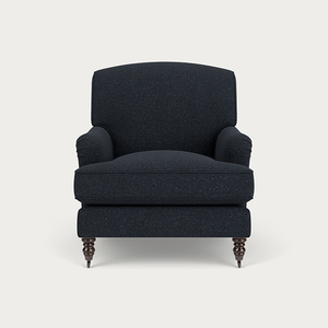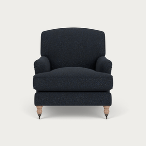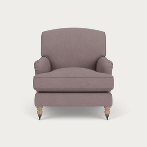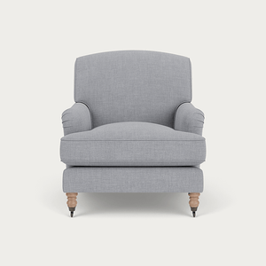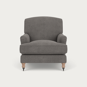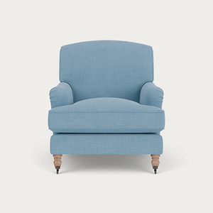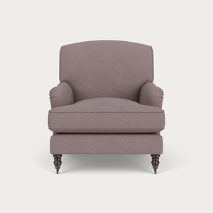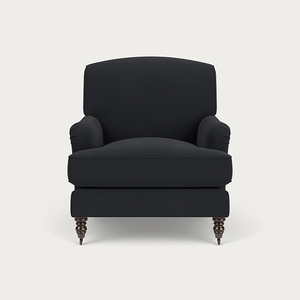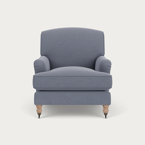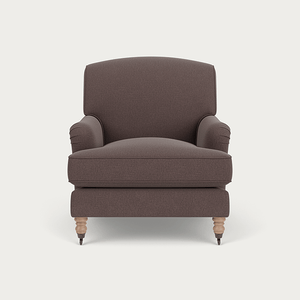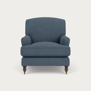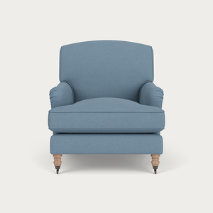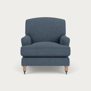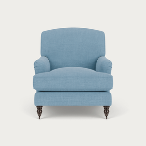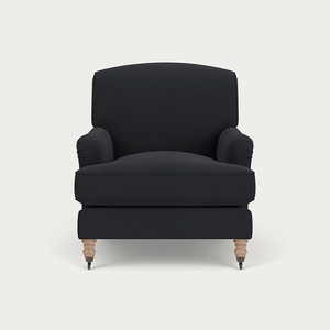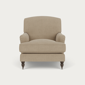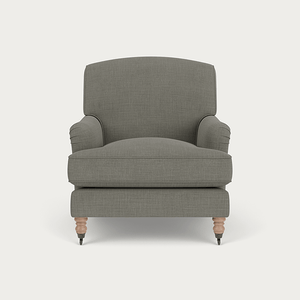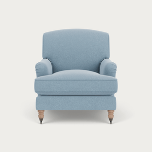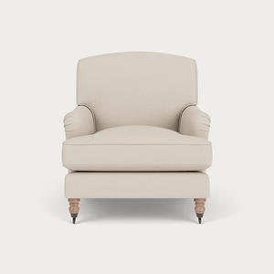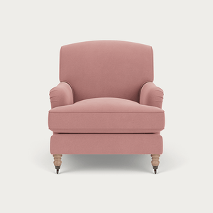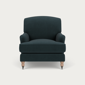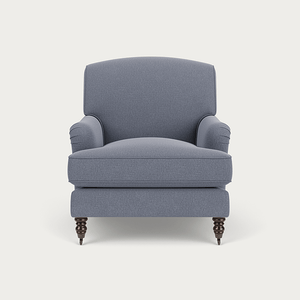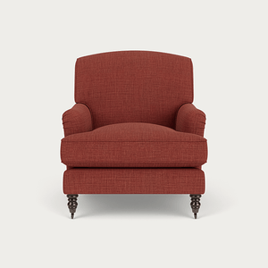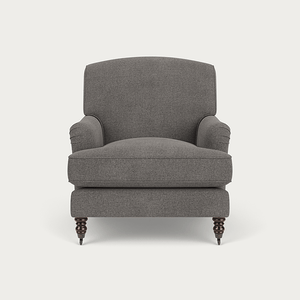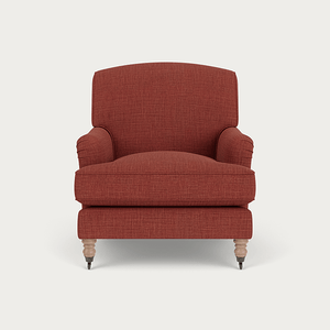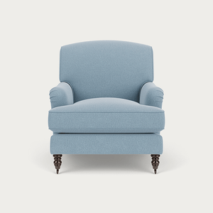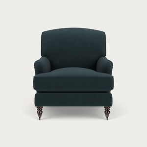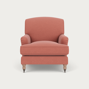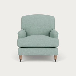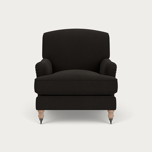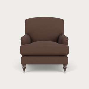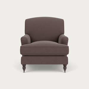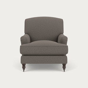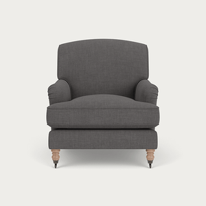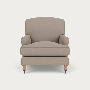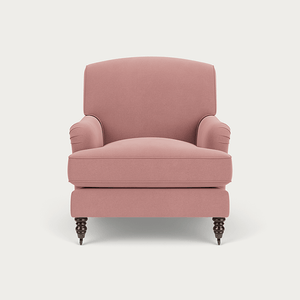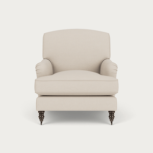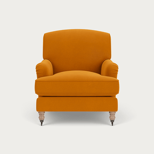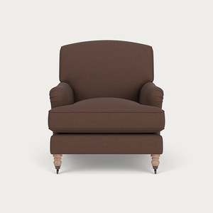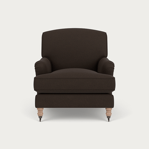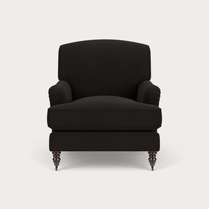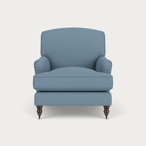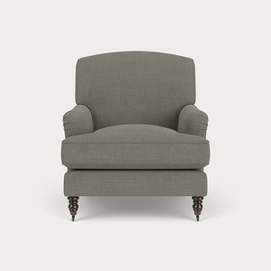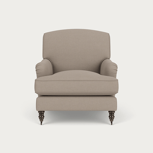 This armchair’s stately silhouette draws upon classic English upholstery, with a generous seat and integrated back that’s perfect for scatter cushions. Neat scroll and tuck details to the backrest and armrests give it a smart, tailored look. Resting on traditional turned legs and brass castors, Olivia is an armchair for the ages.