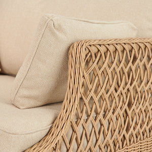 Crafted from UV-resistant all-weather wicker, meticulously handwoven around a rust-proof aluminium frame, Longmeadow's contemporary lattice design lets sunlight shine through,