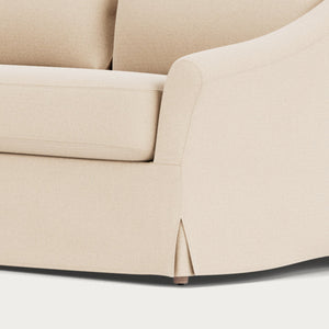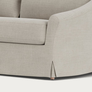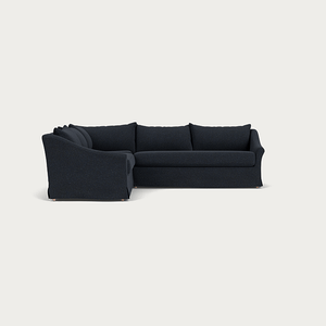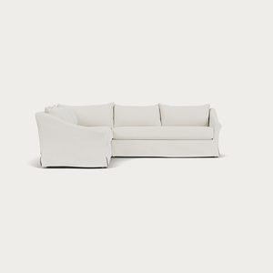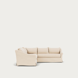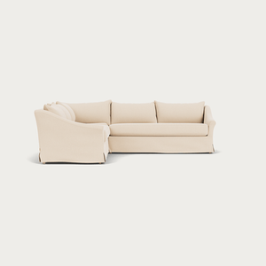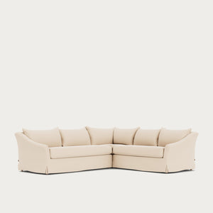 Dieses modulare Sechssitzer-Sofa ist vom lässigen belgischen Chic inspiriert. Es ist einseitig verlängert und bietet so ein geräumiges Design, das sich in eine Ecke oder mitten im Raum einfügt und so einen separaten Sitzbereich schafft. Jedes Modul verfügt über einen abnehmbaren, losen Leinenbezug, der passgenau auf den Rahmen zugeschnitten ist und über Eckfalten am fließenden Rock verfügt.