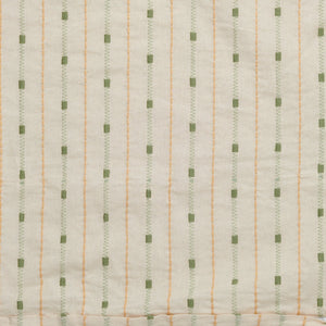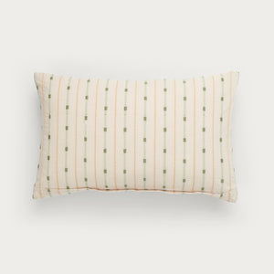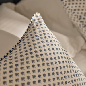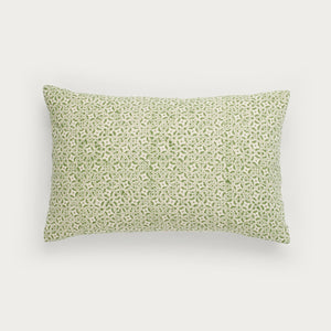 Das Frida-Kissen besticht durch einen handgeschnitzten geometrischen Blockdruck auf der einen Seite und eine aufwendige Handstickerei auf der anderen Seite – beides Zeugnisse der Kunstfertigkeit erfahrener Kunsthandwerker. Dieses rechteckige, mit Federn gefüllte Kissen aus weicher Baumwolle hat ungepaspelte Kanten und einen verdeckten Reißverschluss für ein klares, modernes Finish und verleiht jedem Raum Struktur, Farbe und Muster.
