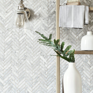 Kennet is our Carrara marble tile that comes in three shapes – rectangular, herringbone, and hexagon. The tiles have a honed finish and can be used on walls or floors, making them perfect for the bathroom.