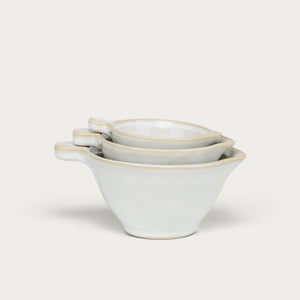 Crafted from durable stoneware by skilled artisans in Portugal, the white Bramley pouring cups are finished with a hand-applied reactive glaze that creates a unique speckled effect. An essential addition to any kitchen, this set of three pouring cups have easy-to-use handles and spout, and can be stacked together for easy storage.