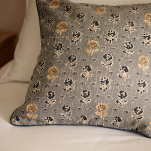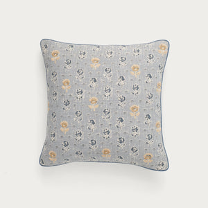 The Clover cushion features a repeat screen-printed floral design in soft blue and pale ochre, enhanced with delicate embroidery that showcases the artistry of skilled artisans. Framed with piped edging for a polished finish and complete with a concealed zip, this feather-filled cushion adds a refined touch of texture and colour, making it a beautiful accent for a bed or sofa.