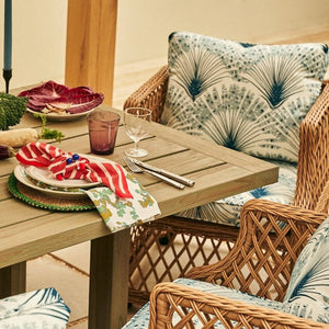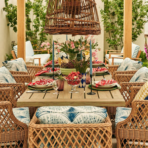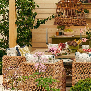 Crafted from UV-resistant all-weather wicker, meticulously handwoven around a rust-proof aluminium frame, Longmeadow's contemporary lattice design lets sunlight shine through,