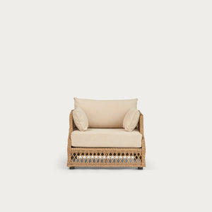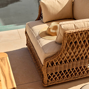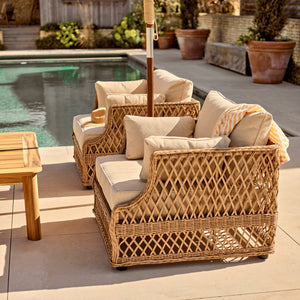 Handwoven from durable all-weather wicker, Longmeadow's small sofa and two relaxed armchairs are finished in a warm honey-colour that perfectly complements Kew's teak coffee table. Paired with weather-resistant cushions, the set makes for the perfect spot to while away an afternoon in the sun with friends.