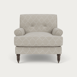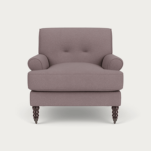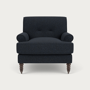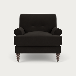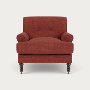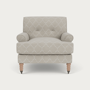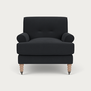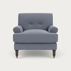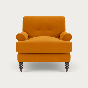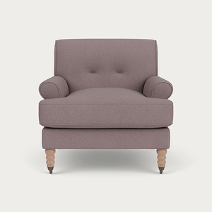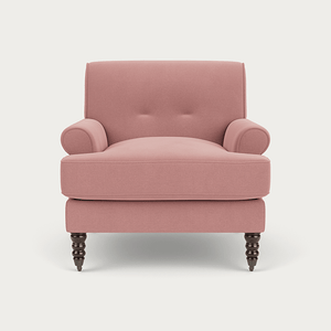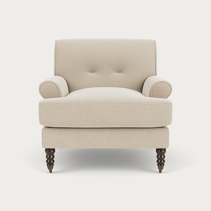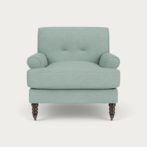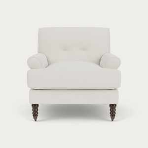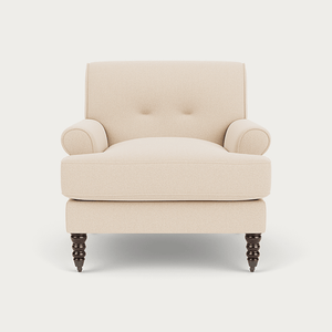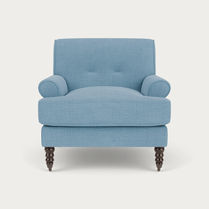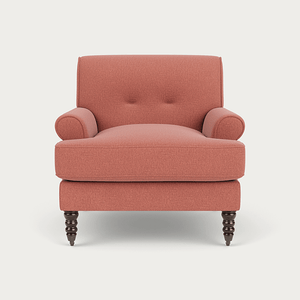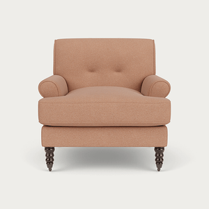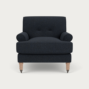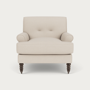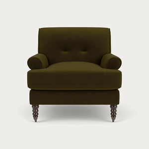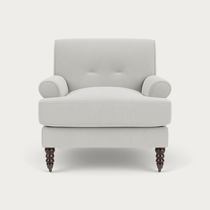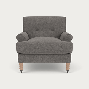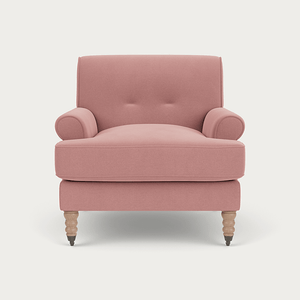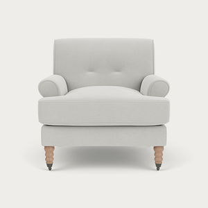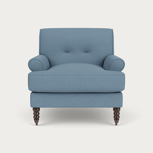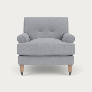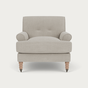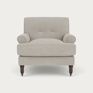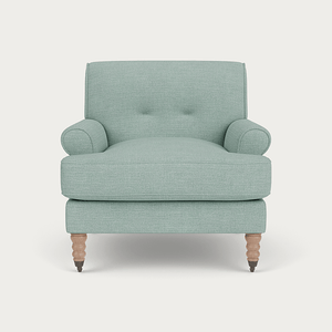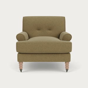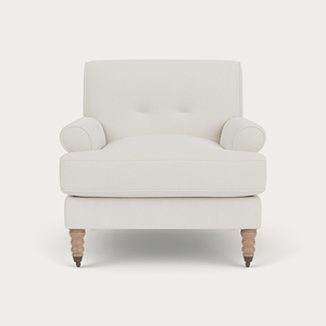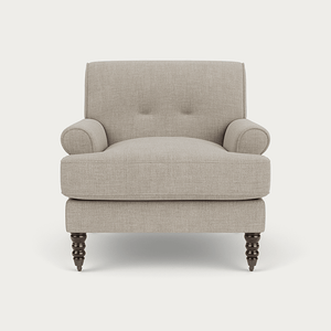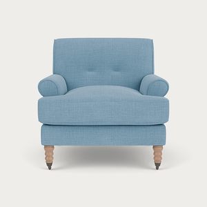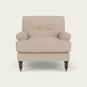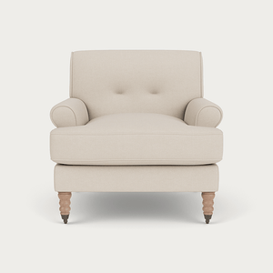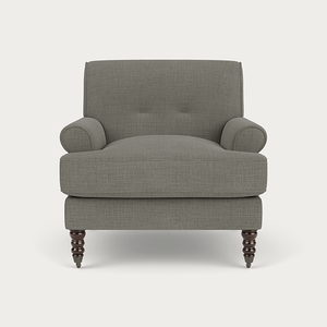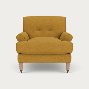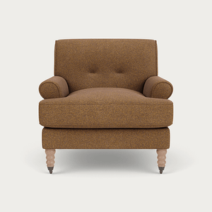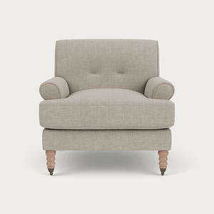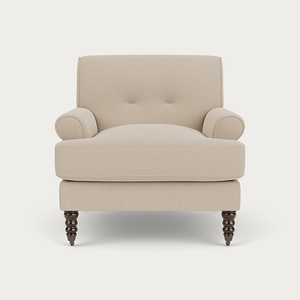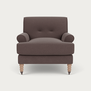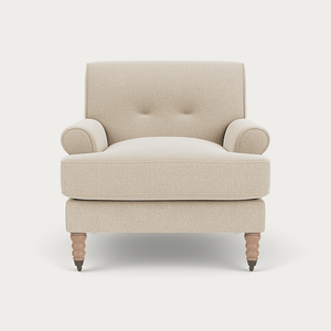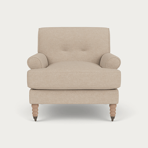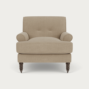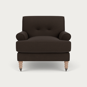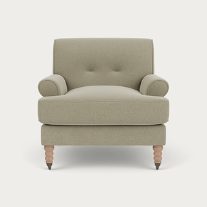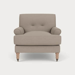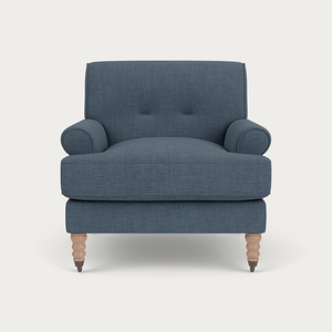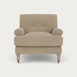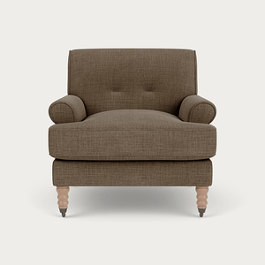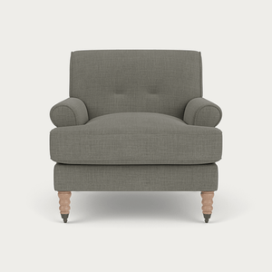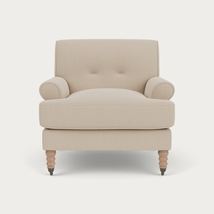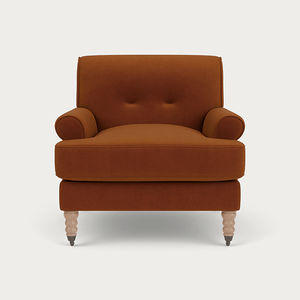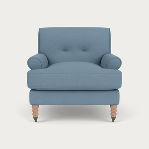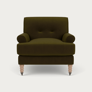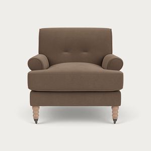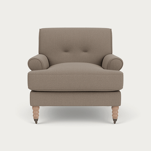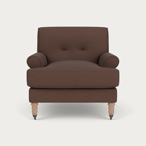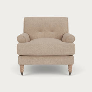 This hand-upholstered armchair stands for understated elegance. With a deep seat and gently scrolled back and armrests, George is supremely comfortable yet still feels refined. The turned oak legs with brass castors and pin-tuck tailoring across the back give the chair a stately aesthetic that'll look equally at home in town and country households.