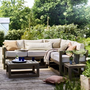 All our garden furniture cushions are made from natural-coloured, weather-resistant fabric, so you needn’t bring them inside if there’s a quick summer shower. They’re not completely weatherproof, though, so don’t leave them out all year long or in pouring rain. They’re filled with foam, which is soft but keeps its shape well, and the covers are removable, so they’re easy to clean.