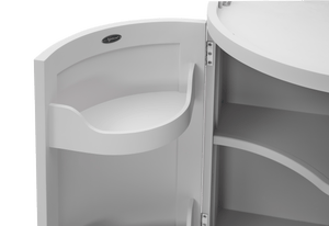 Our Chichester fitted bathroom cabinets are configurable, so were designed for those homes that need an unusual size or a specific arrangement of storage. They have the same classic look as our freestanding washstands, but you can mix the various cabinets and then bring them together with skirting and your choice of work surface so they look like one solid piece. This curved base cabinet can go at one end or both of either a long or short run of cabinets if you want something softer on the eye.