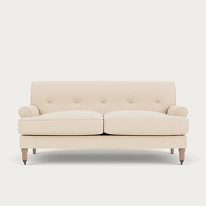 One of our more formal designs, the two-seater George sofa is thoughtfully proportioned with a reduced depth that makes it a considered choice for more compact layouts. Upholstered by hand, it features a gently scrolled backrest and traditional pin-tuck tailoring. The kiln-dried tulipwood and birch plywood frame is crafted using traditional techniques to ensure lifelong durability. And below, turned solid oak legs rest on brass castors for a look that's stately yet understated.