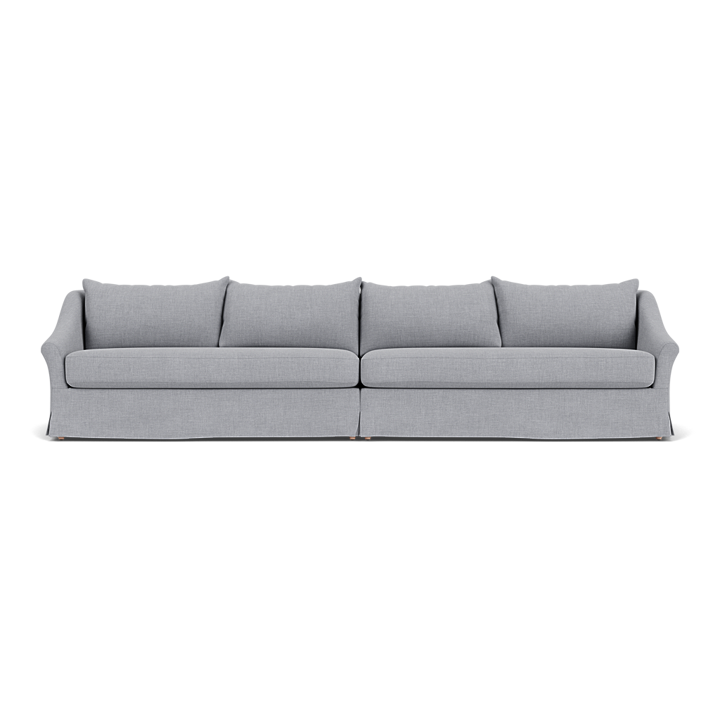 This six-seater modular sofa captures the spirit of laidback coastal living, inspired by our founders' travels along the East Coast of America. Its soft, oversized silhouette is paired with natural linen textures that evoke a sense of effortless 'Belgian chic'. The loose covers are precision-tailored and fastened with concealed wooden toggles and discreet Velcro points. A flowing skirt, detailed with corner kick pleats, brings a relaxed elegance to the overall look. Inside, the back cushions are sectioned into internal pockets to help them retain their shape, and are filled with a perfect blend of feather, fibre, and foam for comfort.