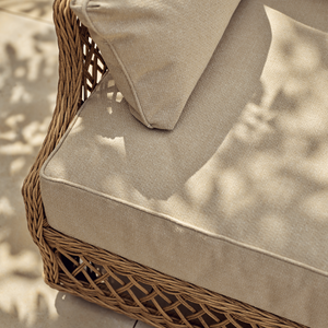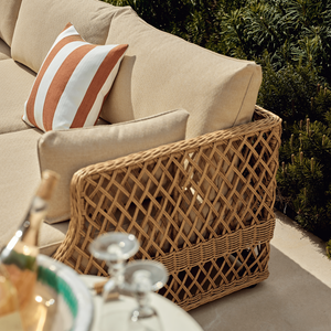 Longmeadow is our contemporary take on the classic wicker garden style. Handwoven from our durable all-weather wicker, its minimal lattice design lets sunlight shine through and is finished in a warm honey-colour. With weather-resistant cushions in a textured woven fabric, this generous sofa makes for the perfect spot to lounge outdoors with your feet up or with loved ones.