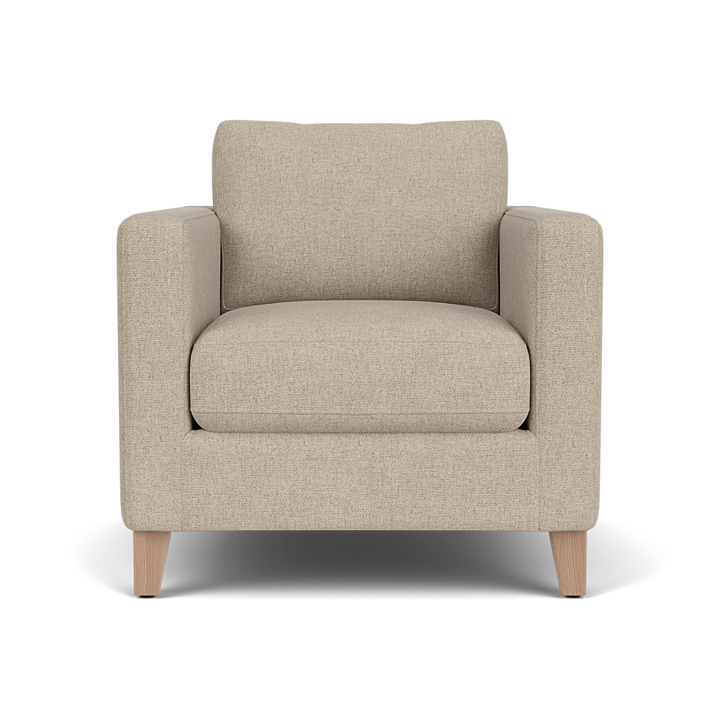 Taking the minimalist silhouette of the Shoreditch sofa, this armchair features a clean, architectural design for a contemporary look. Crafted from kiln-dried tulipwood and birch plywood frame for lasting durability, it rests on square tapered oak legs. Generously filled seat and back cushions provide deep, supportive comfort, while the square shape creates an enveloping feel.