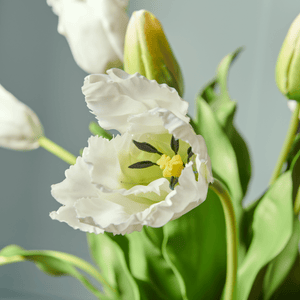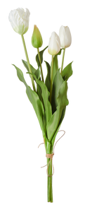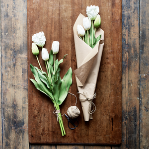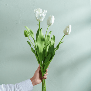 Our lifelike tulips feature snowy white petals and a sheath of green leaves, all with a waxy tactility that makes them as realistic to touch as they are to look at. This bunch is perfect for gifting or adding straight to a vase, or you can weave them into a wider arrangement.